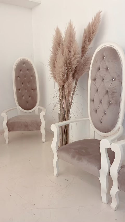Lot de 2 trônes de mariage en velours beige et bois peint blanc cassé